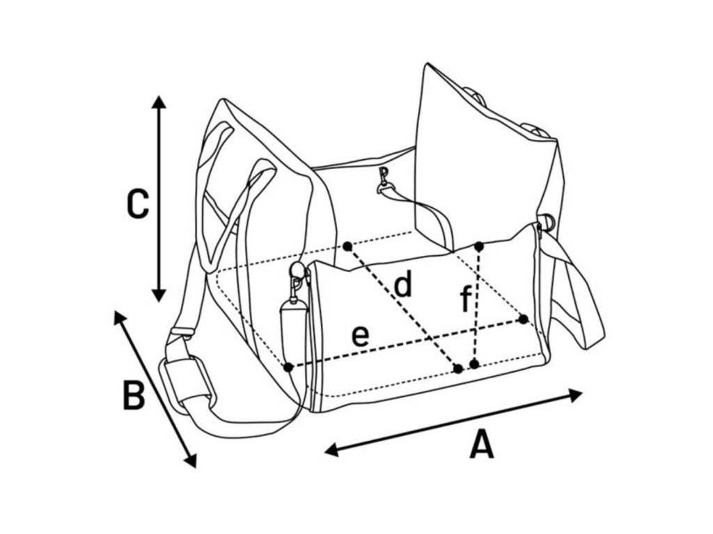 - Rozměry (cca): A = 60 cm, B = 60 cm, C = 33 cm, d = 37 cm, e = 38 cm, f = 24 cm (viz obrázek)