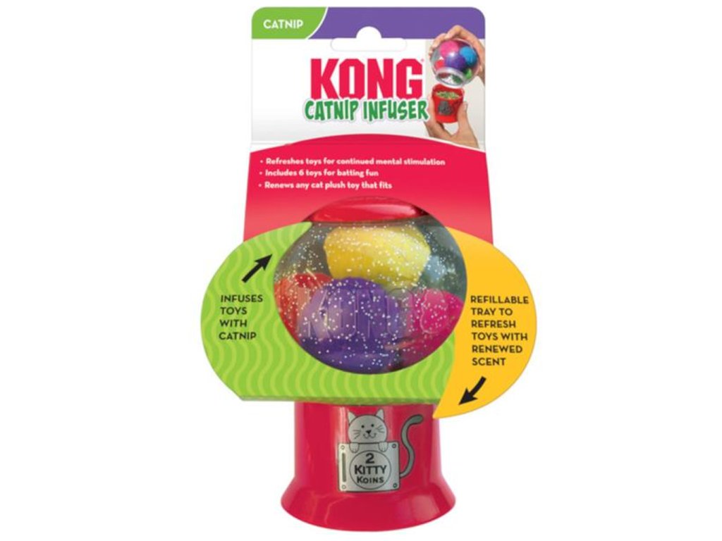 Aroma infuzér KONG pro kočky obsahuje šest žvýkacích kouliček provoněných catnipem – šantou kočičí, přírodní nenávykovou bylinou, která svou vůní uchvátí až 70 % koček a vzbudí v nich touhu si hrát. Infuzér má tvar koule opatřené dvěma protilehlými závity. Zespodu zašroubujete znovuplnitelný zásobník na sušený catnip. Doplněním bylinky do zásobníku lze obnovit to správné aroma, které proudí dovnitř koule přes plastové sítko. Odšroubováním její vrchní čepičky vysypete žvýkací kouličky a na jejich místo můžete umístit jinou, například plyšovou hračku pro kočky.