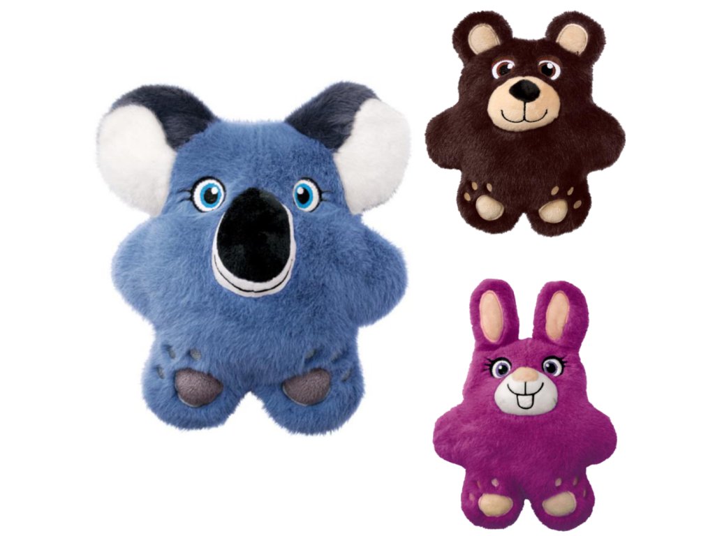 KONG Snuzzles pro psy připomíná malý baculatý polštář s výrazně vyčnívajícím sametovým čumákem a zvlněnými okraji tvořenými ušima a roztaženými končetinami. Hračka je vyrobena z mimořádně hebkého a jemného plyše, který je velmi příjemný na dotek i žvýkání. Vašim psům poskytne spoustu zábavy, protože při každém jejím skousnutí se ozve dlouhé a hlasité pískání a uši koaly jsou vyplněny šustivým materiálem. Hračku lze použít nejlépe v interiéru. Není příliš veliká a díky svému plochému tvaru, vystouplému čumáku a zvlněným okrajům ji lze snadno přenášet v tlamě. Je vhodná pro psy všech velikostí.