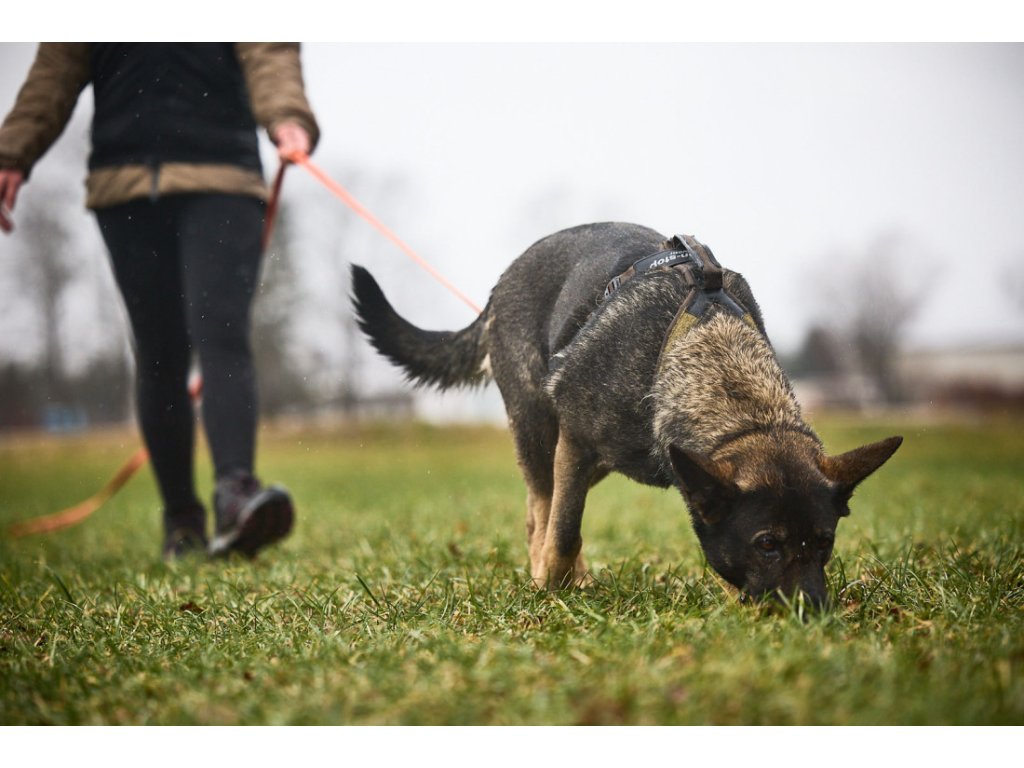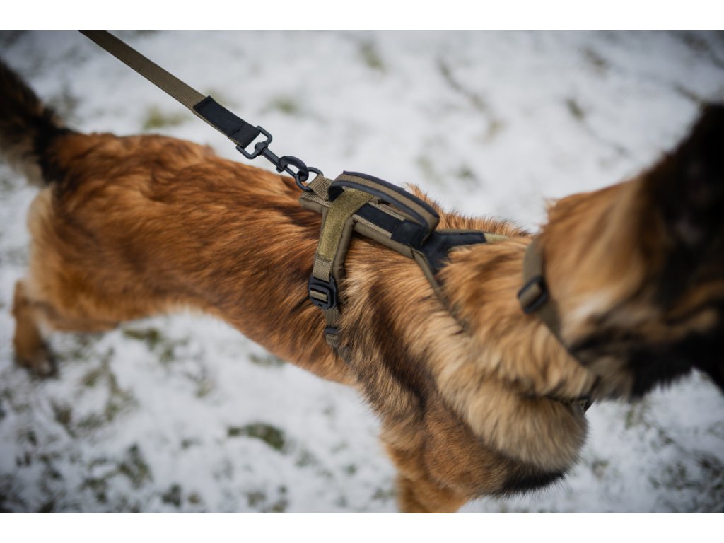 Krátký postroj Line Harness Grip WD je součástí odolné edice Working Dog určené pro vojenské, policejní a záchranářské psy, ale hodí se i pro hafany v jiném vysokém pracovním nebo sportovním výkonu. Popruhy jsou vyrobeny z hustě tkaných nylonových vláken a na exponovaných místech jsou ještě zesíleny materiálem Hypalon. Všechny švy a okraje jsou na vnitřní straně prošity tak, aby k tělu psa směřovaly hladkou stranou. Vodítko můžete pomocí D-kroužku připnout na hřbet psa, jeden upevňovací bod se pak nachází i na hrudníku, kam můžete připnout stopovačku. Kovové spony a kroužky vydrží i hrubší zacházení, stejně jako madlo na hřbetu, pomocí nějž můžete s hafanem lépe manipulovat třeba u překážek nebo u držení psa během výcviku.